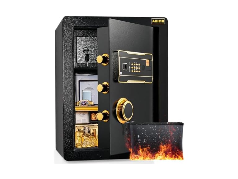 - Waterproof & Fireproof Money Bag for Extra Protection: Our ADIMO safe comes with a fireproof waterproof money safe bag, providing an extra layer of security for your small valuables. Perfect for storing cash, checks, credit cards, jewelry, and important documents, this fire-resistant feature ensures your essential items are protected against both water and fire damage.