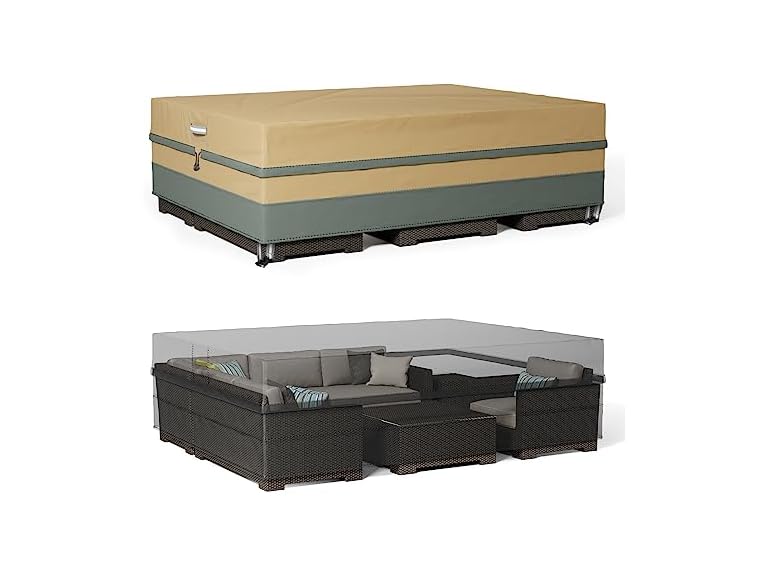 - 【VENT AND PAD HANDLE】Our rectangular patio table cover is equipped with a padded handle, which makes it easier to put or remove in seconds. Large vents at patio sofa cover both ends keep air flowing, reducing internal condensation, moisture buildup, and wind blowing. Effectively prevent external moisture from entering the interior and keep the furniture dry and clean.