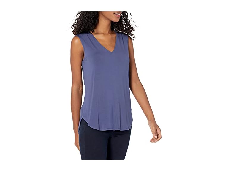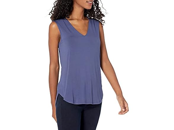 - DETAILS: Easy pull-on tank for all-day comfort. Features a classic v-neck, wide tank straps, and feminine curved shirt tail hem.