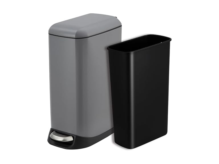 - dainslef Bathroom Trash Can with Lid, Stainless Steel Kitchen Trash Can with 3.2 Gallon, Soft Close Step-On Pedal, Fingerprint-Resistant Finish for Kitchen or Bathroom, Gray.