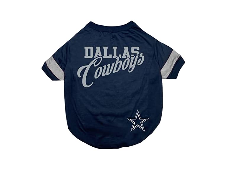 - (1) Pets First NFL Dallas Cowboys Dog & Cat T-Shirt, Small. Football Pet Shirt with Team Name & Logo, Striped Sleeves, Poly-cotton Material, Machine Washable