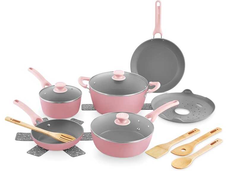 - (1) DASH Dream Green Nonstick Ceramic Cookware Set, 15 Piece, Pink - Recycled Aluminum and Ceramic, Nonstick Cookware Set, Oven Safe and Compatible with All Cooktops