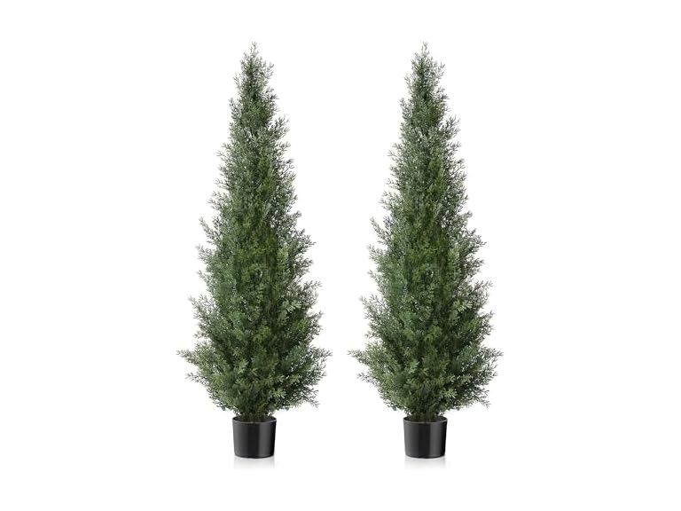 - UV Protected Front Door Decor: Crafted with UV protection, our 3 ft artificial cedar trees ensure vibrant color and vitality throughout the seasons. These faux plants for outdoor use are designed to stay lush and green year-round. Enjoy the timeless appeal of cedar topiary without the maintenance.