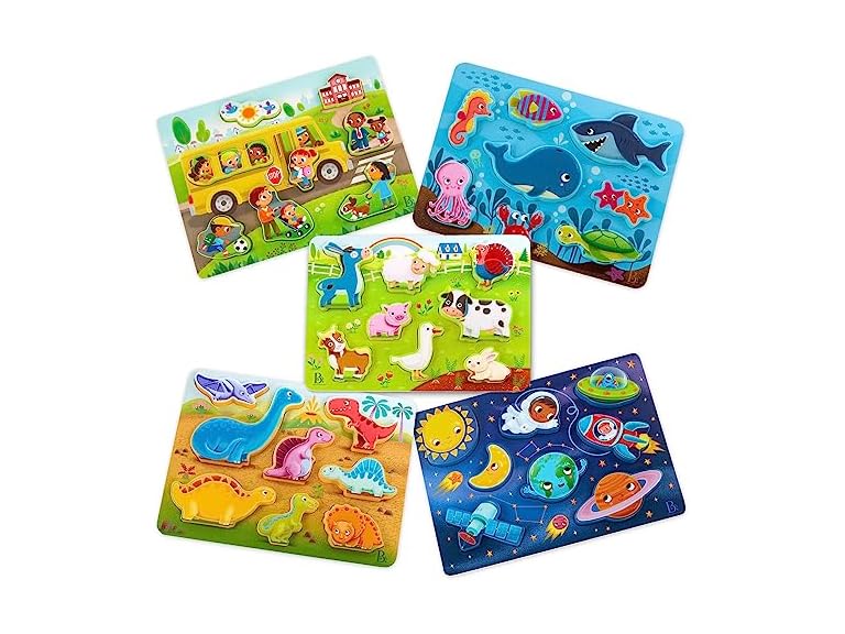 - (1) B. toys – Peek & Explore 5 – Pack: Bus, Farm, Sea, Space, Dino – Chunky Puzzle 5 – Pack – Wooden Puzzles – 8 Pieces Each – 2+ Years
