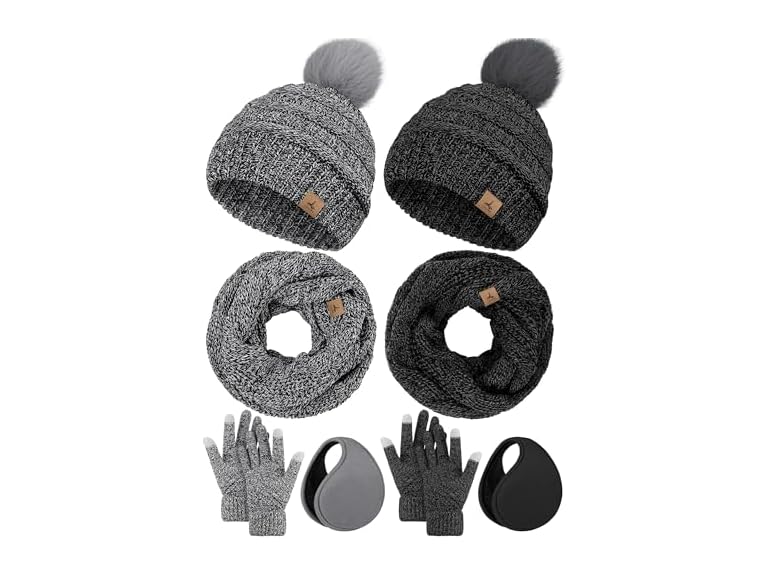- Basic Product - There are two winter sets, one is black gray mix and the other is black white mix. Each set includes a beanie, a scarf, an ear muffs, and a pair of gloves, fully equipped for cold weather.