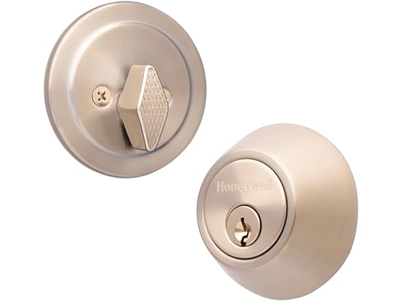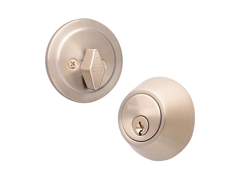- Honeywell Safes & Door Locks - Single Cylinder Front Door Deadbolt Lock Set - Anti-Bump Resistant Dead Bolt Lock for Exterior Doors with 2 Entry Keys - Satin Nickel, 3 x 5 x 8.5 in - 8111309