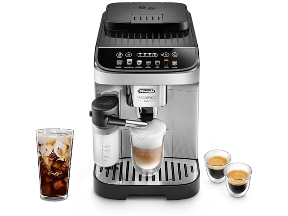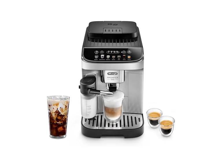 - (1) DDe'Longhi Magnifica Evo Automatic Espresso & Coffee Machine with Auto Milk Frother, Built-in Grinder & Auto-Clean Function - For Latte, Cappuccino, Americano, Iced Coffee, ECAM29084SB , Silver