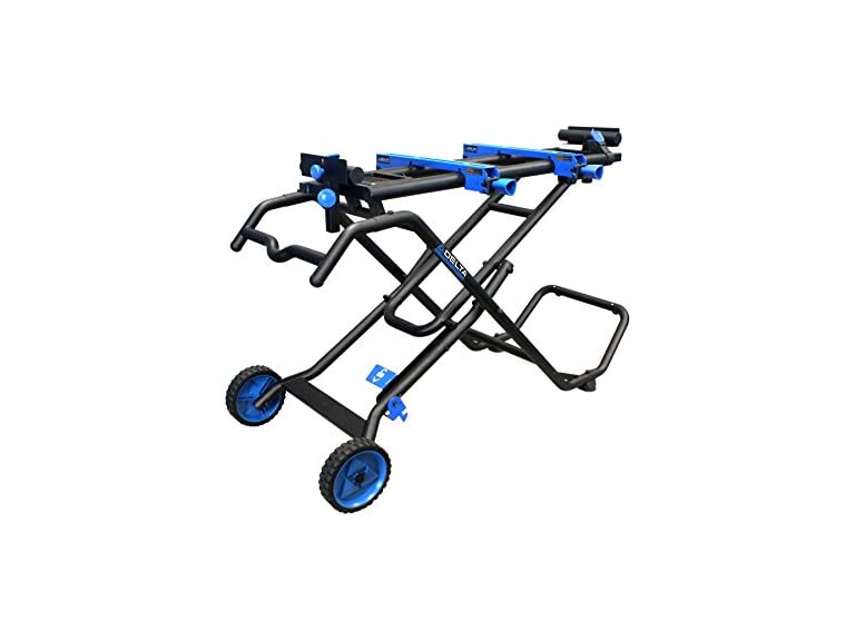 - Large wheels and wide rubber, semi-pneumatic, tires makes moving miter saws from one job to another fast and easy, even up and down steps