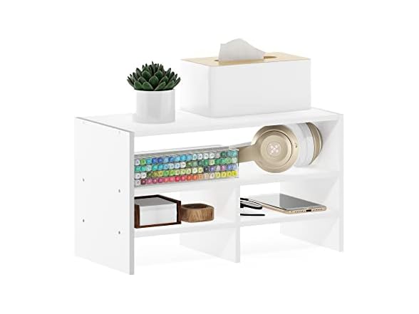 - Multiple color options for easy customization. Functional desktop shelf design is suitable for any room that fully utilizes the table top storage space.