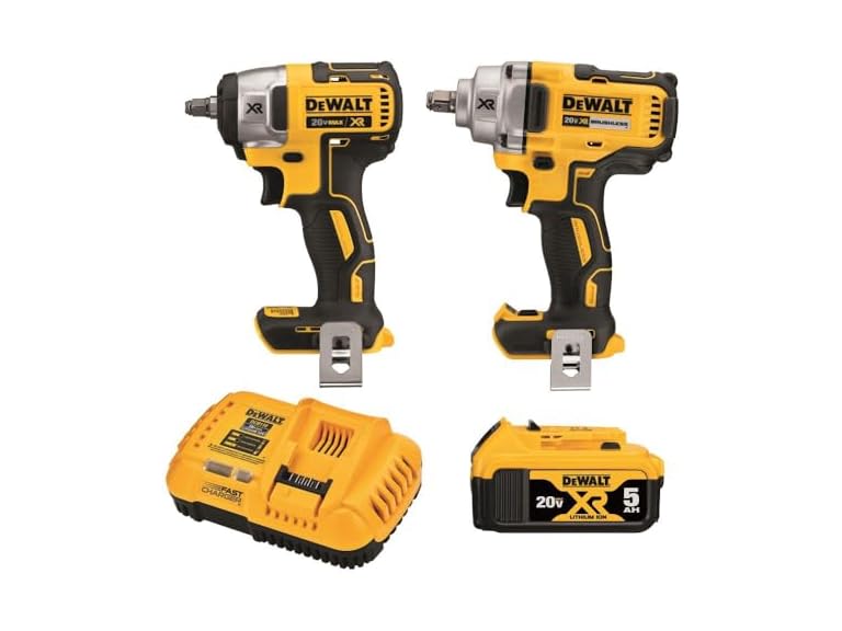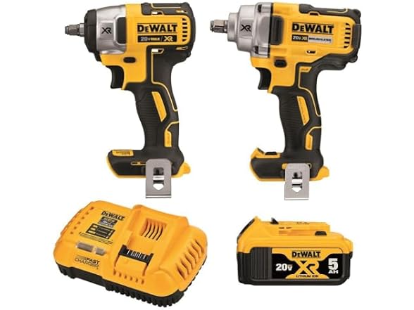 - (1) DEWALT DCK205P1 20V MAX Impact Wrench, Cordless 2-Tool Combo Kit, 1/2-Inch Mid-Range and 3/8-inch Compact with 5ah Battery and Charger Kit - includes (1) DCF894 20V MAX* XR 1/2 in. Mid-Range Impact Wrench; (1) DCF890 20V MAX* XR 3/8 in. Compact Impact Wrench; (1) DCB205 20V MAX* XR 5Ah Battery; (1) DCB118 8 Amp Fast Charger