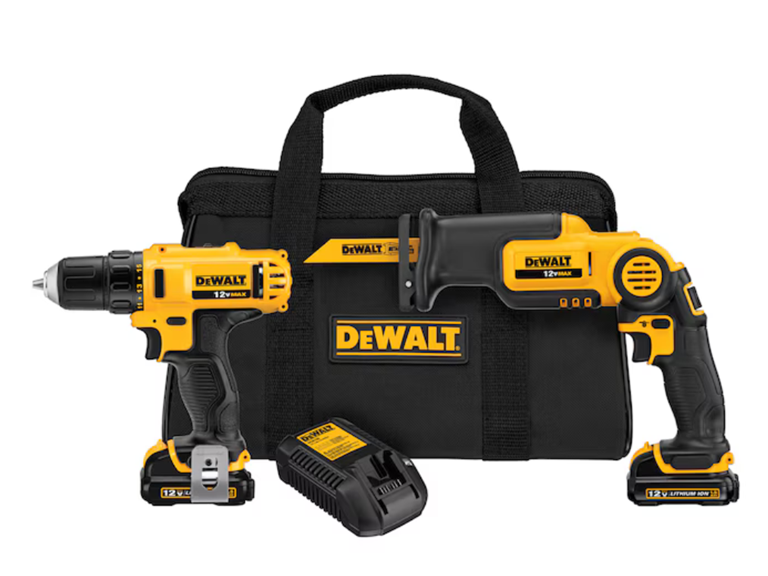 - Includes 3/8-in drill/driver (DCD710), pivoting recip saw (DCS310), two 12-volt MAX lithium ion 1.5Ah batteries, a fast charger, a belt hook, one 4-in 6 TPI wood cutting recip blade, one 4-in 18 TPI metal cutting recip blade and a contractor bag