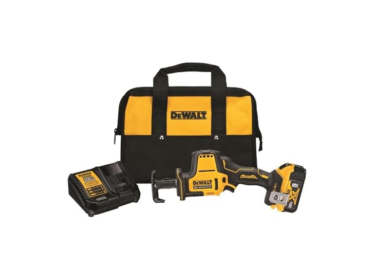 - (1) DEWALT DCS369P1 Atomic 20V Max* Cordless One-Handed Reciprocating Saw Kit one 20V max* 5.0 Ah battery, charger, belt hook, tool bag, and two blades.