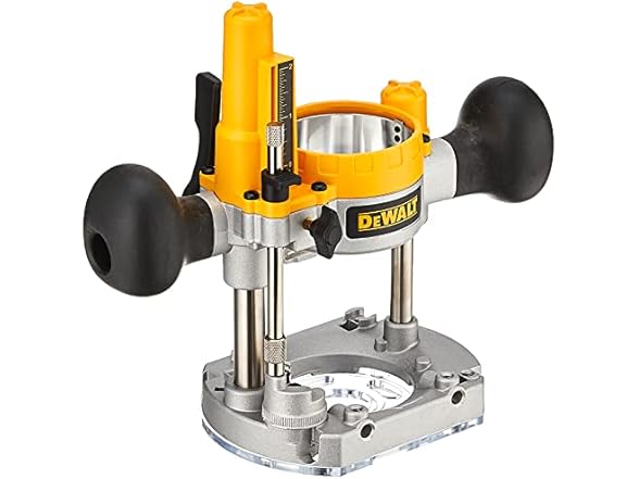 The DEWALT DNP612 Plunge Base for Compact Router has an sdjustable, tool-free steel motor cam lock that makes depth adjustment and base changes quick and solid-locking. It has precision machined brass bushings and case-hardened steel guide rods that provide a smooth and accurate plunge stroke. It has a xlear, LEXAN sub-base to provide enhanced base durability, bit visibility, and accepts standard template guide bushings. The rubber overmolded handles and low center of gravity design provide best-in-class user comfort, balance, and control. IT has a heavy-duty, precision machined, die-cast aluminum base and motor housing for durability and low tool weight. The five position, adjustable turret stop assists in stepped or repeated plunge cuts and it has micro-fine depth adjustment on the plunge base 5/128" per turn for precise routing in veneer and inlays. It also has an easy to reach plunge lever and switch for superior control while routing.