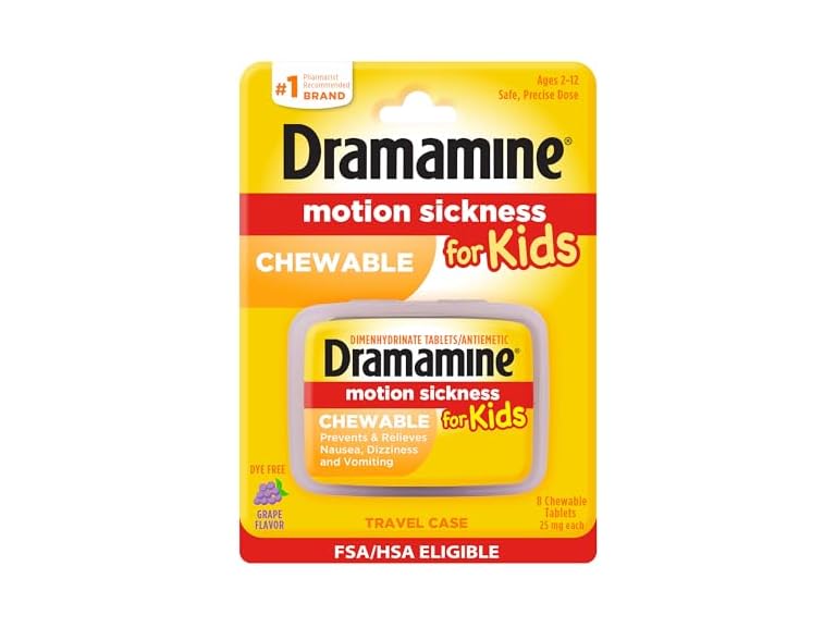 - (1) Dramamine Motion Sickness Relief for Kids | Chewable Grape | 8 Count