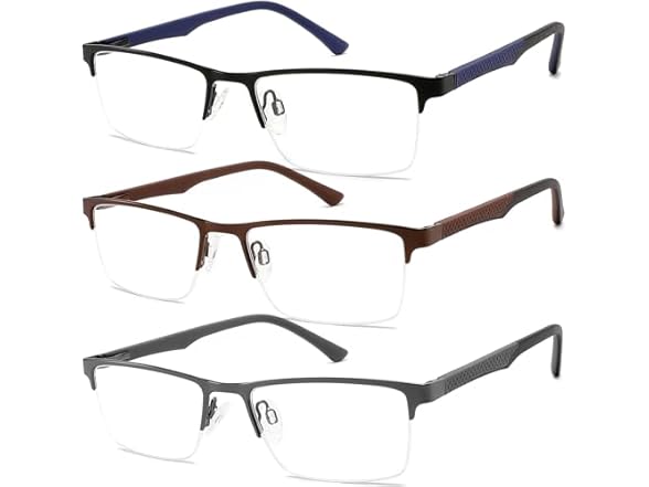 - [3 PACK MENS COMPUTER READERS]: Great value 3 pack half metal frame eyeglasses,classic color.Suitable for any occasions.Leave one at home,at work,in your car's glove box,or in your purse,backpack,or carry all to have handy when and where you need them.Excellent gifts for men.