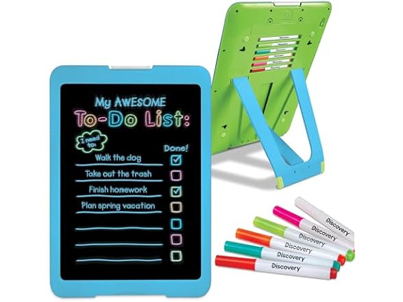 - (1) Discovery Neon Glow Drawing Easel w/ 6 Color Markers, Built-in Kickstand/Wall Mount, 5 Light Modes, Easy Clean/Washable, Wide Screen, Flat Storage, Portable Travel Activity, Electronic Activity