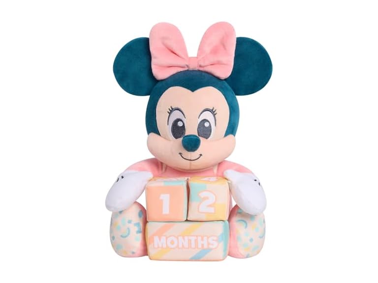 - Mark the Milestones: Irresistibly soft plush Minnie Mouse helps commemorate every milestone with 3 plush blocks—2 with numbered sides, and 1 block with sides that read “Week,” “Month,” and “Year.”