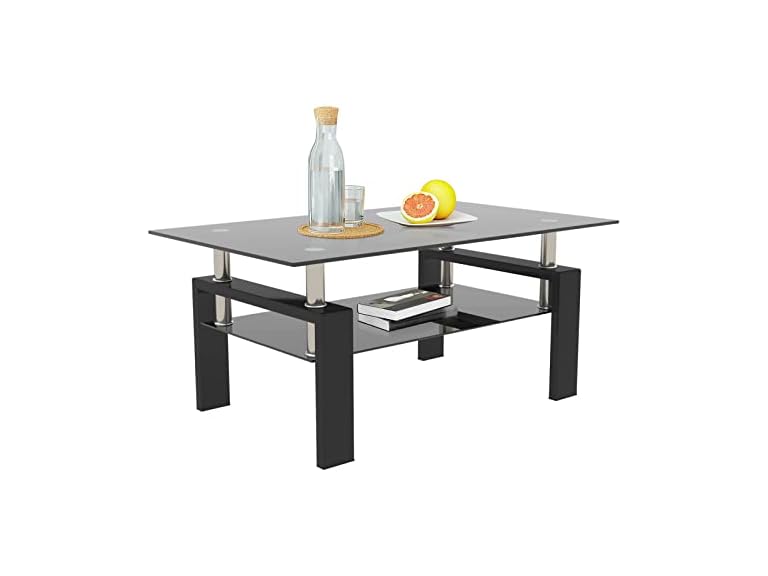 - (1) DKLGG Glass Coffee Table, Rectangle Center Table Living Room Tables with Lower Shelf, 2-Tier Modern Black Coffee Table w/Metal Tube Legs, Glass Tables for Living Room Waiting Area, All Black