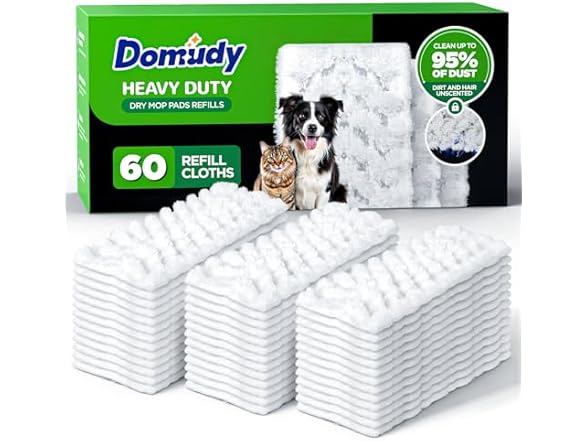 - (1) Domudy 60 Count Heavy Duty Dry Sweeping Cloths Refills for Swiffer Sweeper Mop, Deep Clean Sweeper Pet Mop Pads for Multi Surface Floor Mopping & Cleaning, Disposable Dry Pad Refills Floor Duster, Unscented
