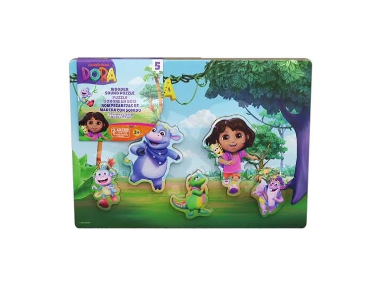 - (1) Spin Master Games, Dora The Explorer Sound Puzzle, 5-Piece Wood Puzzle for Toddlers & Kids, with Sounds, Wooden Toddler Learning Toy, for Ages 3 & Up