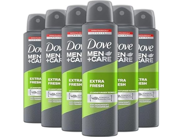 - Dove Men + Care Antiperspirant Deodorant Spray, 6 Pack, 48H Protection, Long-Lasting Extra Fresh Scent, Soothes & Moisturises Skin, 5 oz. Each