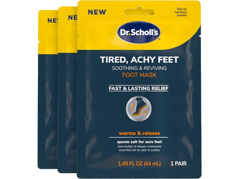 - (1) Dr. Scholl's Tired, Achy Feet Soothing & Reviving Foot Mask, 3-Pairs Moisturizing Socks, Warming Booties with Epsom Salt, Shea Butter, Lavender and Essential Oils to Calm,Pack of 8(24 Count)