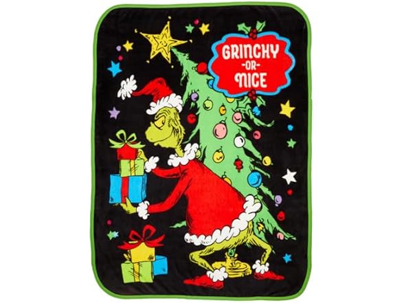 - GRINCH DESIGN: Add a dash of mischief to your holiday decor with the Grinch Holiday Tree Throw. Featuring the Grinch in his classic Santa suit, sneaking gifts under a festive tree, this 46" x 60" throw captures the whimsical spirit of Dr. Seuss's holiday tale. Cozy up with this playful piece that brings a touch of humor to the season.