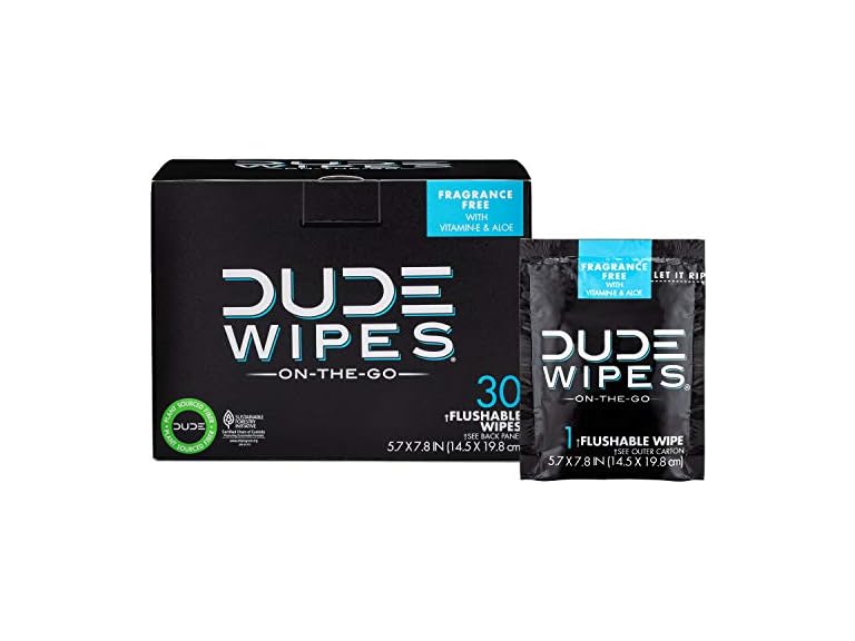 - (1) DUDE Wipes - On-The-Go Flushable Wipes - 30 Wipes - Unscented Extra-Large Adult Wet Wipes - Individually Wrapped for Travel, with Vitamin-E & Aloe, Septic and Sewer Safe