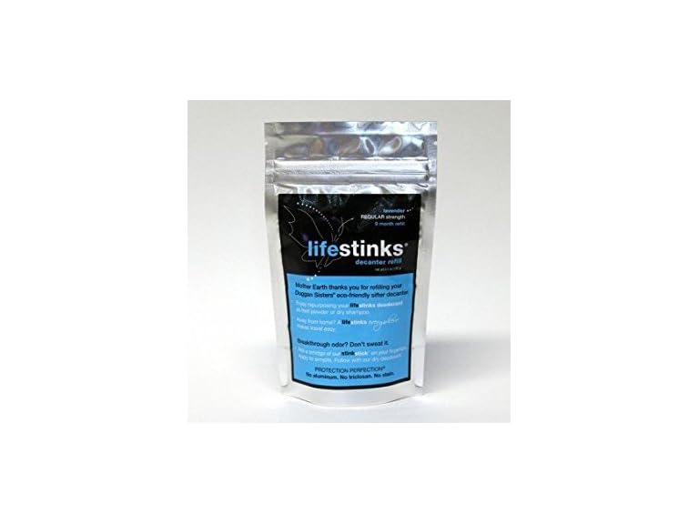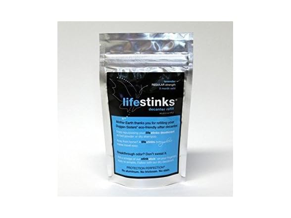 Is it time to refill your eco-friendly sifter container? Make sure you have your original Duggan Sisters lifestinks decanter; it is 100% stainless steel with an ultra-fine mesh for smooth application. It is guaranteed to provide you with quality results by protecting your botanical-rich deodorant from light, cross-contamination and aluminum-laced containers.ALLr This Lavender Regular Strength Refill Bag contains a 9-month supply of lifestinks. Yep, thats right, $2 per month for the worlds smartest and most effective deodorant. Be good to Mother Earth and your budget.rr Aluminum-free. Triclosan-free. Fragrance-free. Talc-free. Stain-free.