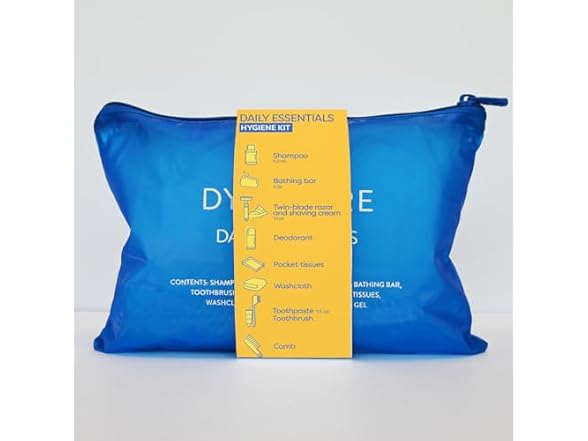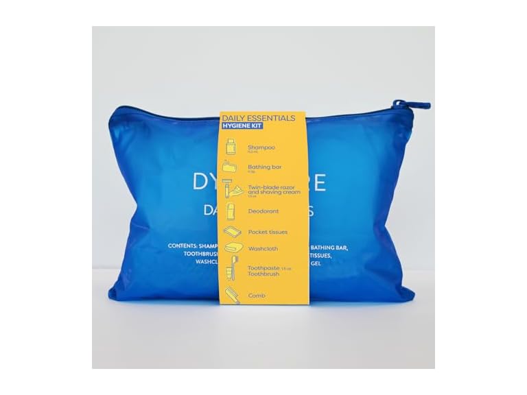 - (1) Dynarex DynaCare Daily Hygiene Kit - Travel Essentials Toiletry Bag - Includes TSA Approved Shampoo, Toothbrush Set, Razor and More - Blue, 1 Kit (10-Pieces)