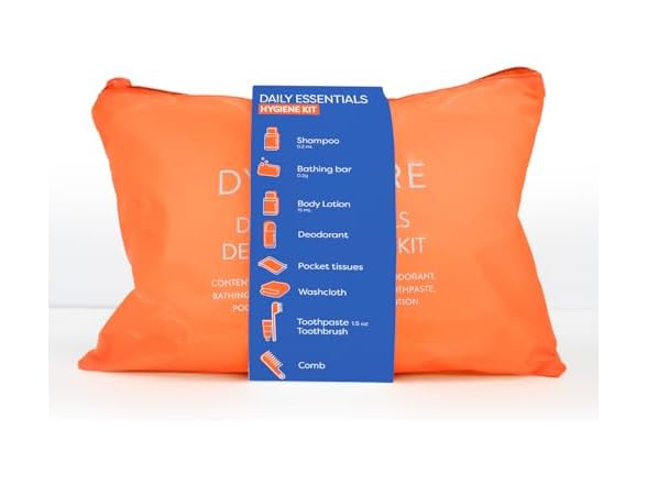 - WHAT'S INCLUDED: This daily essentials hygiene kit for men and women comes with shampoo (0.2 mL), a bathing bar (0.2g), a toothbrush, toothpaste (1.5 oz.), pocket tissues, a washcloth, a comb, and body lotion (0.15 mL).