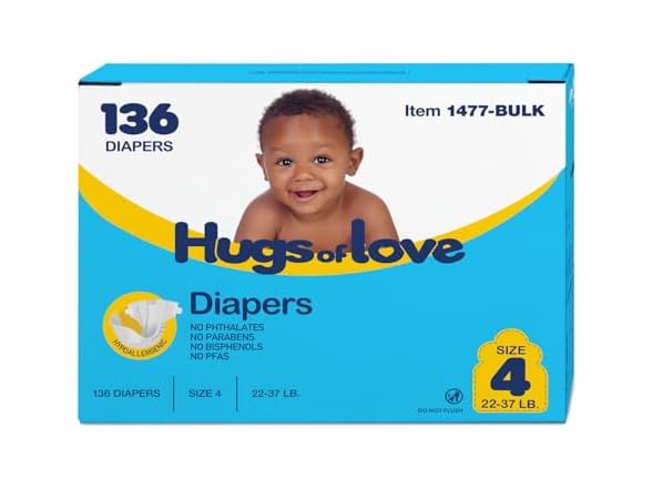 - (1) Dynarex Hugs-of-Love Diapers Size 4 (22-37 lb) Baby Diapers - High Absorbency, Leak Protection, Soft Comfort, 136 Diapers per Case
