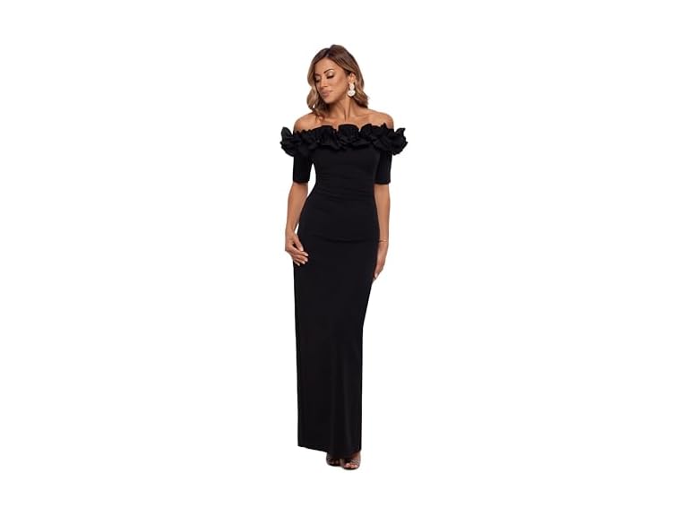 - The ruffle neckline adds a playful yet polished flair to this elegant off-the-shoulder gown.