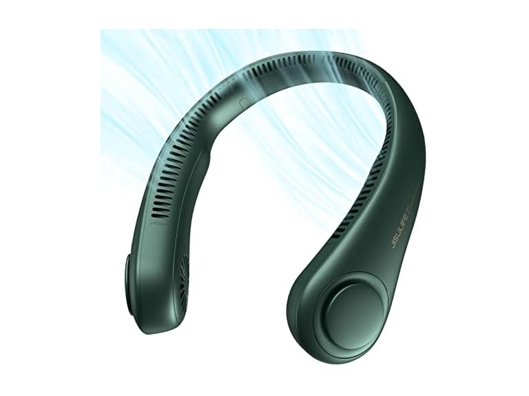 - (1) JISULIFE Portable Neck Fan, Hands Free Bladeless Fan, 5 Speeds, 4000 mAh Battery Operated Wearable Personal Fan, Twistable, Rechargeable, Dark Green