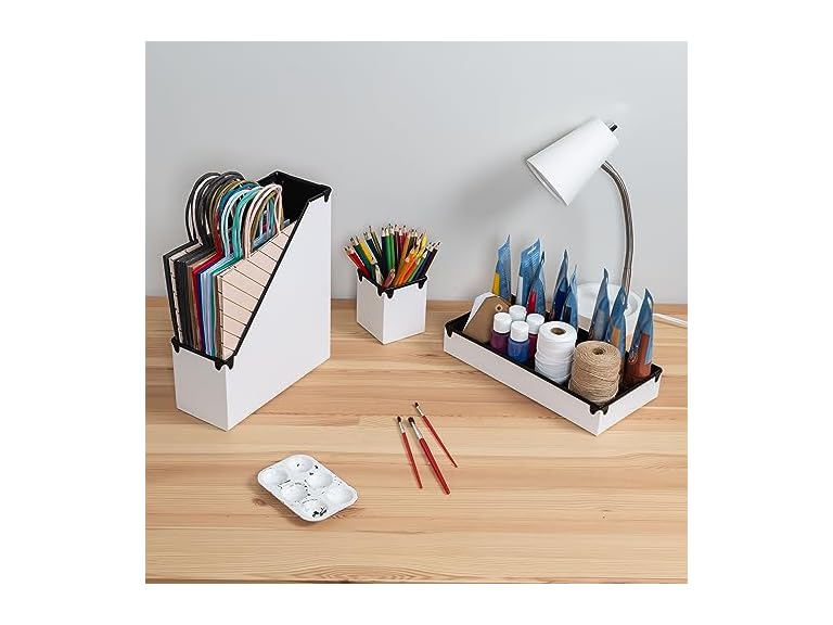 - Includes magazine caddy, pencil cup and divided tray, XL file box, post-it holder and paper tray