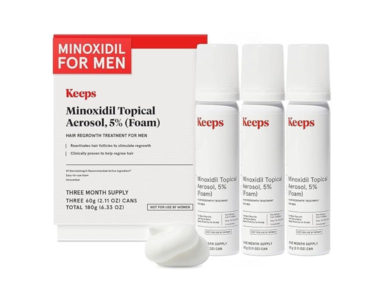- Slow Down Thinning at The Crown: The Keeps 5% Minoxidil Foam for Men is a topical treatment designed to slow hair loss and promote hair regrowth at the crown of the head. When consistently applied twice a day to your scalp, it can help you maintain a fuller head of hair. Includes three 2.11oz bottles, a 3 month supply.