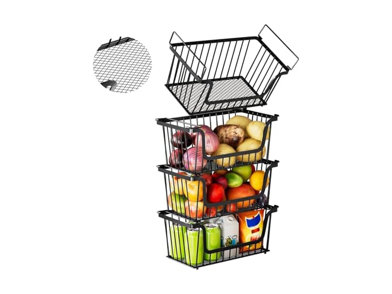 - (1) ANJUBAN Enhanced Leak-Proof Bottom Stackable Wire Baskets, 4 Pack Pantry Organizers and Storage, pantry storage, Shelf Baskets, Fruit Basket, Potato and Onion Storage Bins (Your Choice of Color)