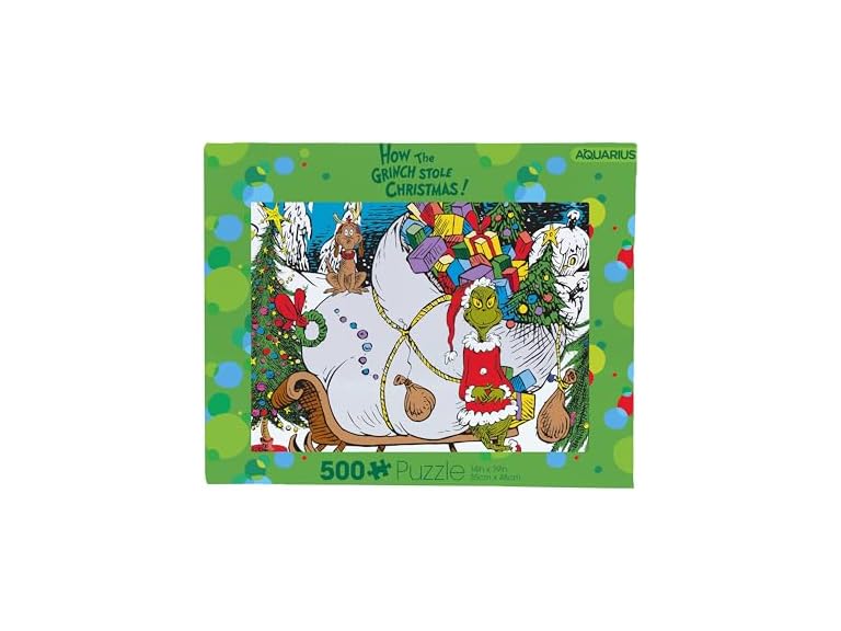 - 500 PIECE JIGSAW PUZZLE: Classic Dr. Seuss fans will love assembling this 500 pc Grinch puzzle featuring the Grinch, his dog Max and their stash of ill-gotten presents. This unique puzzle measures 14 x 19 in.