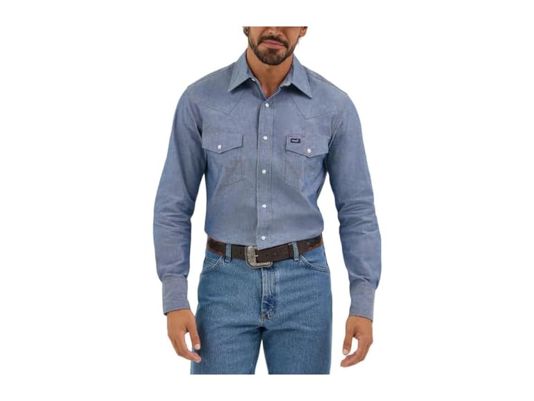 - CLASSIC WESTERN SHIRT. Made for authentic cowboys, this classic western denim shirt is a tried and true classic. Complete with our signature Western finishes - authentic Western front and back yokes, decorative Wrangler "W" logo stitched onto pockets, and classic snap pockets and closures.