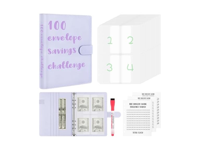 - (1) WenmthG 100 Envelopes Challenge Binder, A5 Money Saving Budget Binder with Upgraded Cash Envelopes & Pen, Budget Savings Challenge Book to Save $5,050, 3 Reusable Laminated Saving Challenge Tracker Included