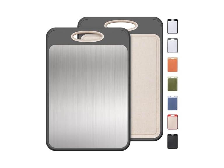 - Dual-Sided Cutting for Versatile Use: The Socisen titanium cutting boards for kitchen features a stainless steel side for slicing meats and a wheat straw PP side for fruits and vegetables. This dual-sided design ensures food safety and versatility, letting you handle different ingredients efficiently. Perfect for everyday cooking, providing a durable and practical cutting solution for your kitchen needs.