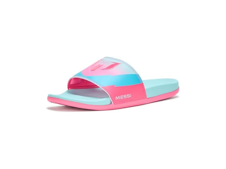 - (1) adidas Unisex Adilette Comfort Messi Slide Sandal, Flash Aqua/Lucid Pink/Lucid Cyan