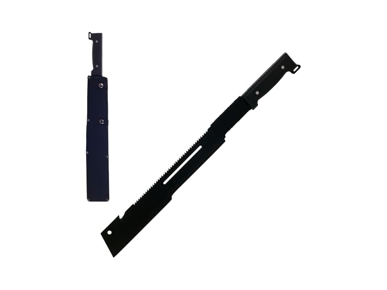 - HEAVY-DUTY MACHETE WITH SHEATH - This 22.75-inch-long sawback machete has a stainless-steel blade that's coated for rust-resistance and features a sawtooth back and cord cutter slot, great for cutting through brush, weeds, and leaves with ease.
