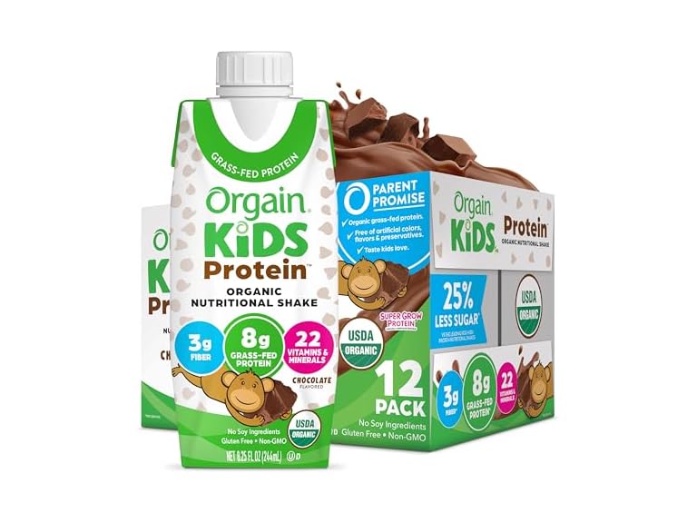 - (1) Orgain Organic Kids Nutritional Protein Shake, Chocolate, Healthy Kids Snacks, 8g Dairy Protein, 3g Fiber, 22 Vitamins & Minerals, No Soy Ingredients, Gluten Free, Non-GMO, 8.25 Fl Oz (Pack of 12)