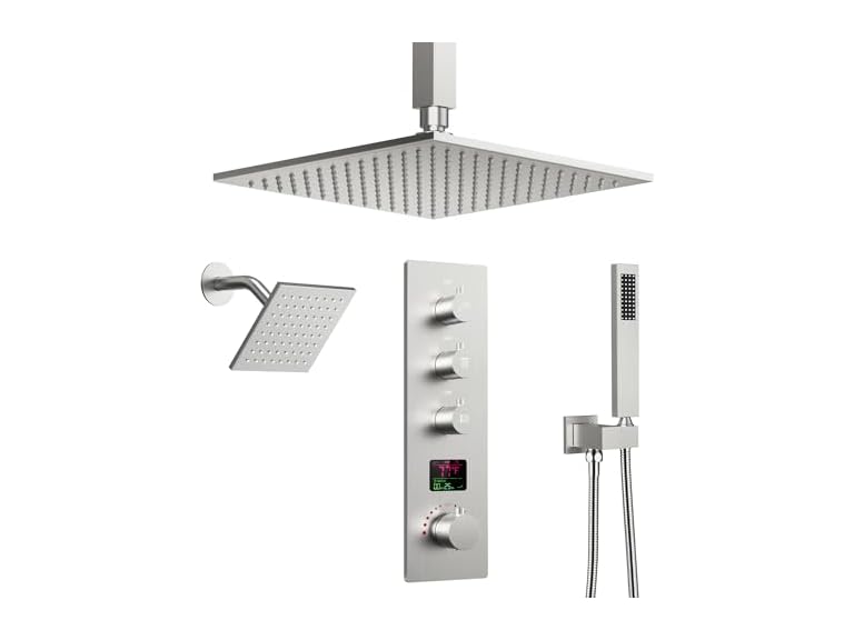- 12 in. Ultra-Thin Shower Head: This ceiling-mounted shower head provides a strong water flow while saving up to 50% of water. It also features three different colored LED strips that change color depending on the temperature and are powered by the water flow, requiring no extra batteries.