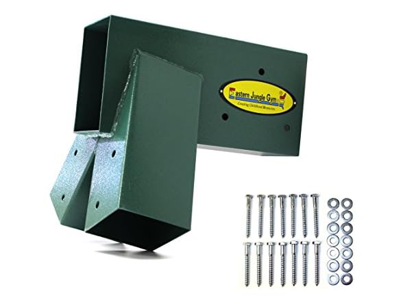 The Eastern Jungle Gym Easy 1-2-3 A-Frame Swing Set Bracket makes building a Swing Set easier than ever! Let us take the guess work out of your DIY swing set with our best selling A-Frame Bracket. Our A-Frame Brackets are the #1 swing set brackets on the market. Made with heavy-duty steel they feature a solid, one piece design with welded seems for the strongest and safest construction - each bracket weighs 10 pounds! Every bracket is finished in a powder-coated green color and our signature yellow tag. The bracket is open-ended with 14 pre-drilled holes. Simply slide your wood into the bracket & screw in your lag bolts into the pre-drilled holes, it's that easy! No measuring or cutting necessary. Our brackets are designed to fit a kiln-dried 4x6 top beam with a true measurement of 3-1/2" x 5-1/2", & four 4x4 side support legs with true measurements of 3-1/2" x 3-1/2". The bracket openings measure 3-5/8" x 5-5/8" and 3-5/8" x 3-5/8". Please do not attempt to force the wood into the bracket. The wood should slide into the bracket easily with a snug fit. If your boards are too large we recommend the wood be planed down to produce a comfortable fit. Please note, these brackets are sold individually and mounting hardware is included. You will need to order two brackets to build an A-Frame play set. When building an A-Frame Swing Set with our brackets we recommend using 1-114" top beam & 4-96" side support legs. The completed dimensions of a swing set using our recommendations is 12'L x 8'D x 7'8"H.