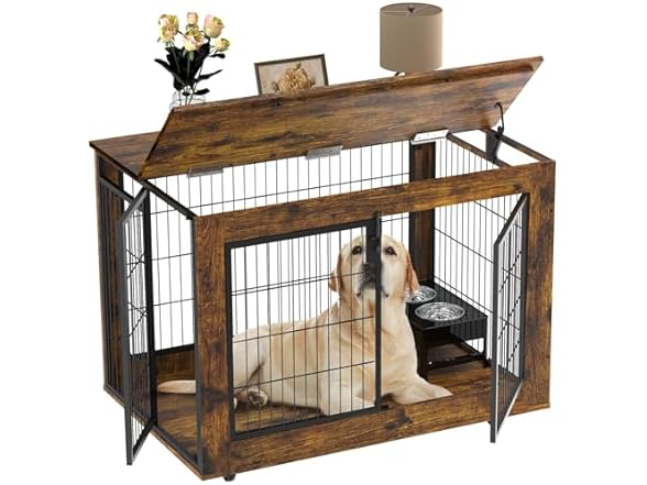 - (1) EasyCom Dog Crate Furniture, 41.33" Extra Large Dog Kennel Indoor with Top-Access Teasing/Feeding Door, Spacious Dog House Moveable Furniture-Style Dog Cage with Wheels-Brown