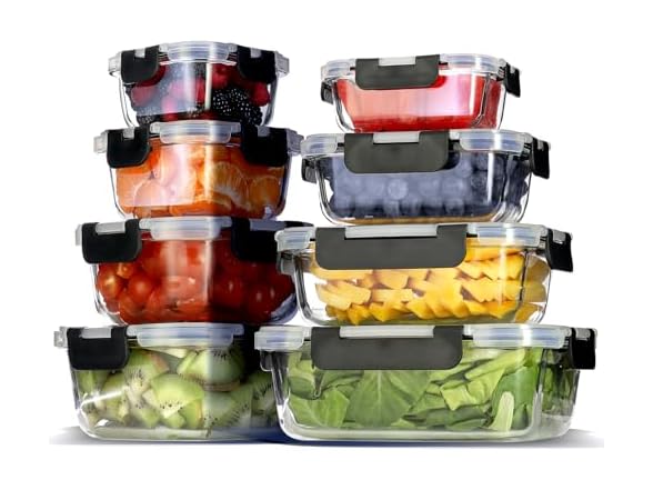 - (1) EATEX 16pc Glass Food Storage Containers with Lids, Airtight Glass Meal Prep Containers, 8 Reusable Food Storage Bins with 8 Leakproof Snap Lock Lids, Oven Microwave Freezer Safe Lunch Containers