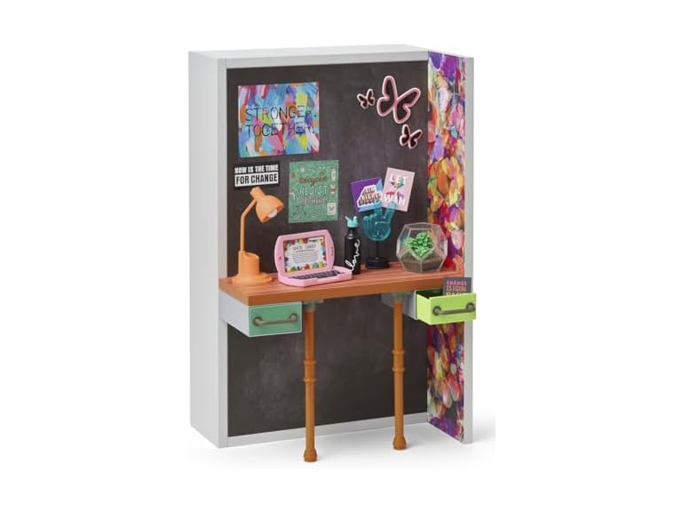 - A vibrant, multicolored wall structure with 360-degree play options. It includes a desk with two drawers on one side, five lockers and four cubbies on the opposite side, and a water bottle refill station on the side of the structure