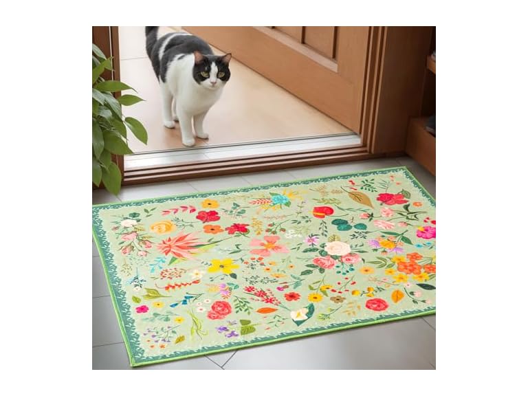 - (1) Boho Floral Entryway Rug 2x3, Washable Small Mat for Bathroom and Kitchen, Non Slip Front Door Mat Indoor Entrance, Vintage Style Flower Mat with Rubber Backing, Soft Area Rug for Entry Way (Green)